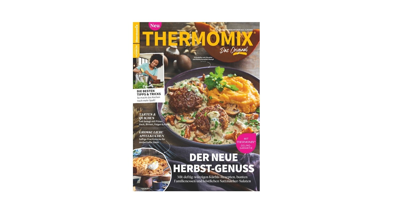 Die erste Ausgabe des neu gestalteten THERMOMIX Magazins erscheint am 1. September 2022 und steigert mit 40 ausgefallenen Rezepten und tollen Hintergrund-Storys die Vorfreude auf die gemütliche Jahreszeit: Deftig-würzige Kürbisgerichte, leckere Tartes und Quiches mit Pilzgemüse, unwiderstehliche Apfelkuchen-Rezepte und köstliche Dessertvariationen geben einen schönen Vorgeschmack auf den Herbst. Außerdem lässt die israelische Kochvirtuosin Haya Molcho in ihrer fröhlichen Art die Leserinnen und Leser hinter die Kulissen der Levante- Küche blicken – man darf gespannt sein! Weitere Informationen unter www.thermomix-magazin.de
