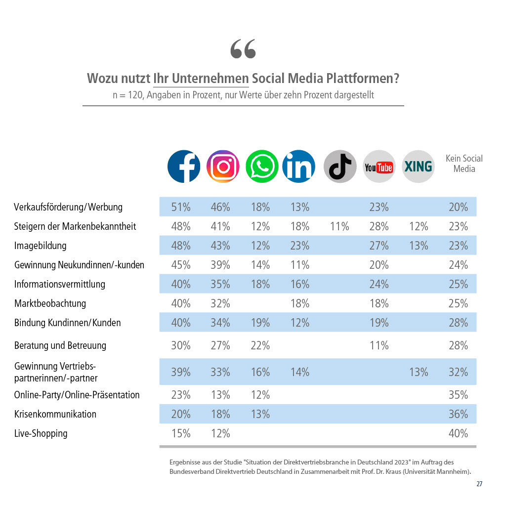 Der Bundesverband Direktvertrieb Deutschland e.V. (BDD) hat gerade seine Studie zur Situation der Direktvertriebsbranche in Deutschland unter der Schirmherrschaft von Prof. Dr. Kraus (Universität Mannheim) veröffentlicht. Die Ergebnisse zeigen, dass sowohl die Direktvertriebsunternehmen als auch die Beraterinnen und Berater Social Media in vielen Bereichen für die Vertriebsförderung und Kundenansprache nutzen. Die Sozialen Medien werden aber auch im Direktvertrieb für die Gewinnung neuer Vertriebspartnerinnen und -partner und die Informationsvermittlung genutzt.