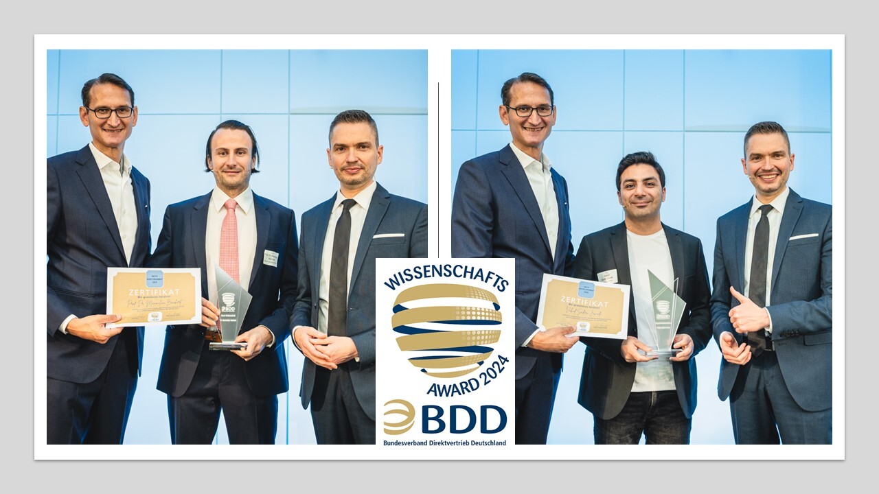 Unter den Preisverleihungen durfte auch der Talente-Nachwuchs nicht fehlen. Zur Förderung der Forschung im Bereich Direktvertrieb lobt der Branchenverband den BDD-WissenschaftsAward aus. Geehrt wurden in diesem Jahr Prof. Dr. Maximilian Beichert (Bocconi University Mailand) für die beste Doktorarbeit mit dem Titel “Essays on Efficient and Sustainable Influencer Marketing “, Tamara Rauw (Universität Lüttich), Belgien für die beste Masterarbeit “Essays on Efficient and Sustainable Influencer Marketing “ und Vahid Sadiri Javadi (Rheinische Friedrich-Wilhelms-Universität Bonn) für die beste Bachelorarbeit mit dem Titel “OpinionConv: Conversational Product Search with Grounded Opinions”.