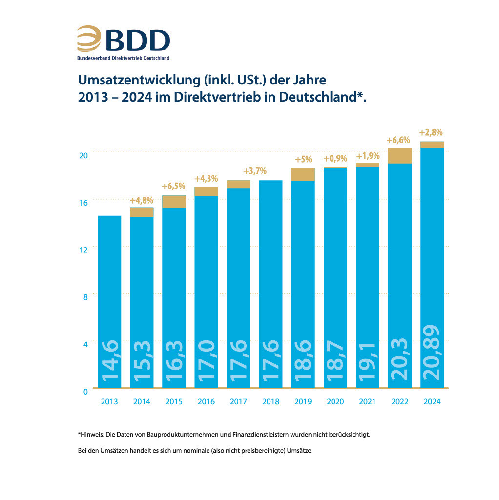 Auch aktuelle Daten unterstreichen die Relevanz des Direktvertriebs: Im Jahr 2024 erzielte die Branche mit 20,89 Milliarden den höchsten Umsatz seit Erhebung der Zahlen durch den BDD vor über zehn Jahren. Über 900.000 Vertriebspartnerinnen und -partnern sind in Deutschland für den Direktvertrieb tätig.
