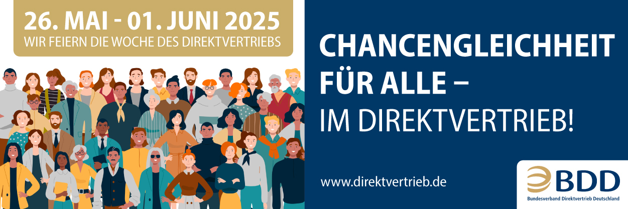 Die vom Bundesverband Direktvertrieb Deutschland (BDD) ins Leben gerufene „Woche des Direktvertriebs“ beginnt am kommenden Montag, 26. Mai 2025. Unter dem diesjährigen Motto „Chancengleichheit für alle – im Direktvertrieb!“ rückt der BDD gemeinsam mit seinen Mitgliedsunternehmen eine zentrale Stärke der Branche in den Fokus: ihre Offenheit, Vielfalt und der Zugang für Menschen aus allen gesellschaftlichen Gruppen.