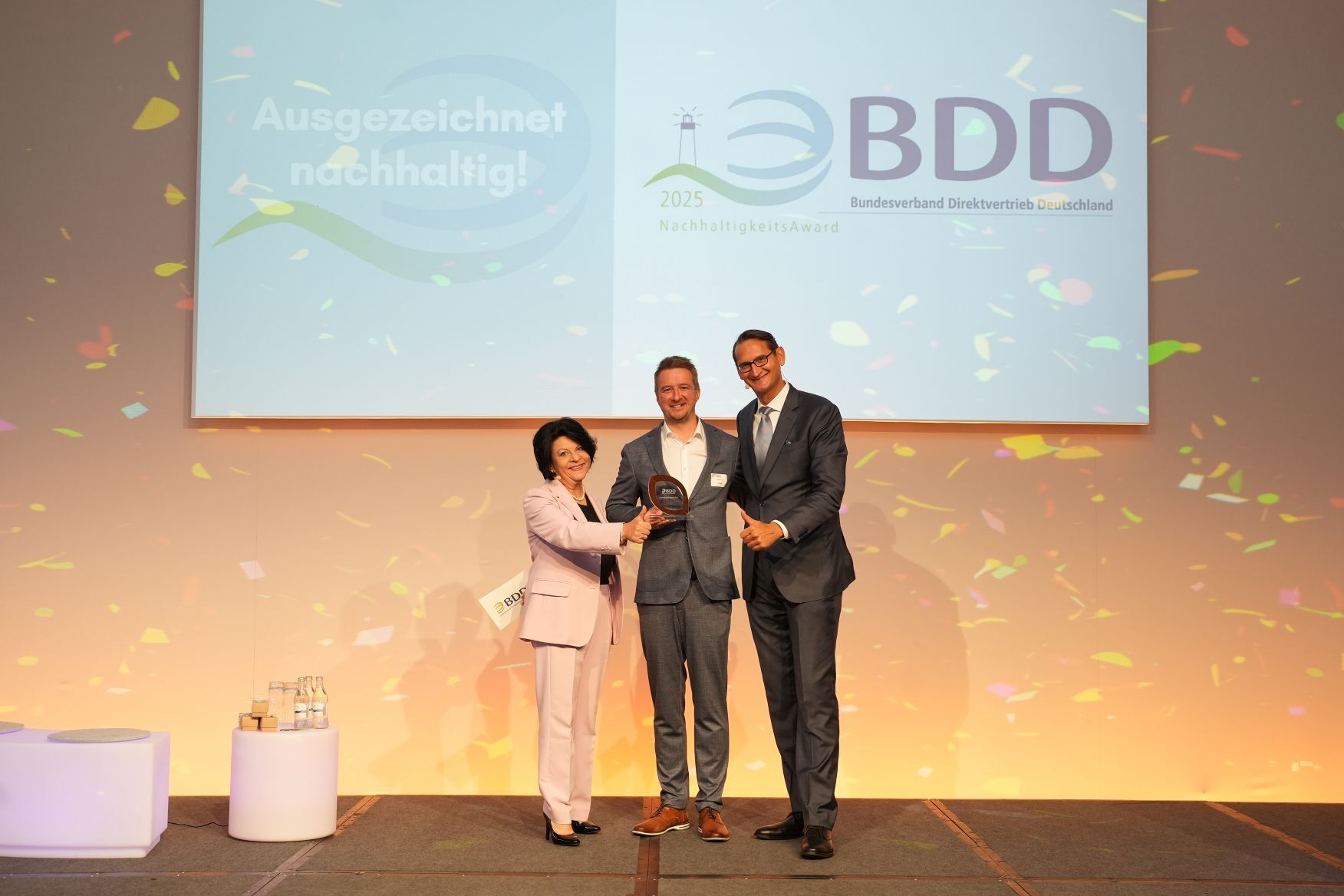 Mit dem BDD NachhaltigkeitsAward würdigt der Verband jährlich Unternehmen, die durch konkrete Maßnahmen und innovative Konzepte einen messbaren Beitrag zu ökologischer, sozialer oder ökonomischer Nachhaltigkeit im Direktvertrieb leisten.